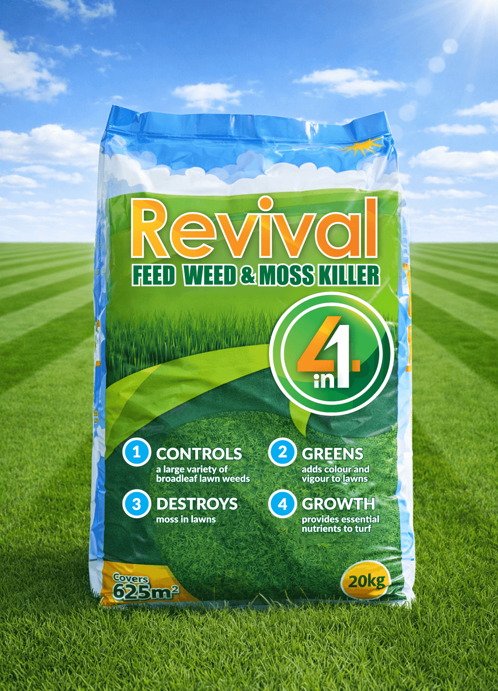 Revival Weed, Feed & Moss Killer is a convenient 4-in-1 treatment that combines lawn fertiliser, a selective systemic weedkiller, and iron to help suppress moss. Its granular formulation makes it well suited for use on established lawns and a wide range of turf areas.