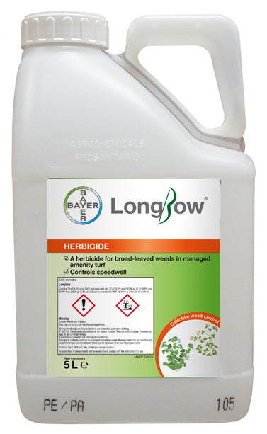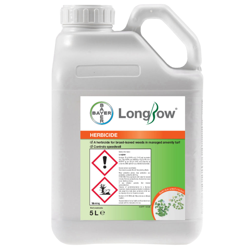 Longbow Application Rates: Longbow Herbicide is available in 5L packs and can be applied to all turf, sports and amenity grasslands and lawns from April to September when weeds are actively growing. Longbow can be applied via a knapsack sprayer or a vehicle mounted sprayer or alternatively a watering can with medium rose. Half fill sprayer with clean water. Add the required quantity of Longbow and complete filling. This aids the effective mixing of all selective herbicides. The product approval does not have any restrictions on the method of application. Application vehicle mounted hydraulic sprayers is allowed so long as the Code of Practice for using Plant Protection Products paragraph '4.6.1 Choosing a method' is followed.